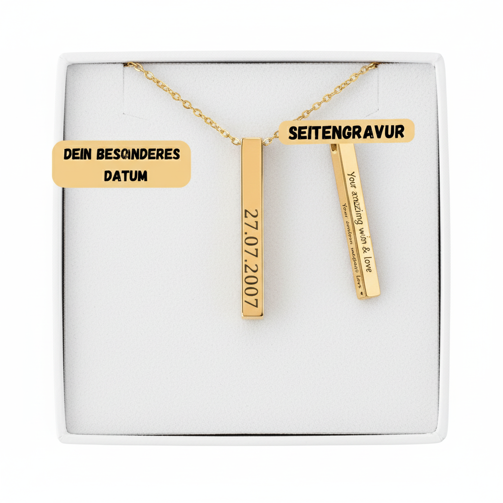 Verewige ein besonderes Datum in deinem Leben mit unserer personalisierteren Halskette. Dieses elegante Schmuckstück verwandelt einen bedeutenden Moment - wie ein Jahrestag, Geburtstag oder ein persönliches Ereignis - in eine zeitlose Erinnerung, die du immer bei dir tragen kannst.